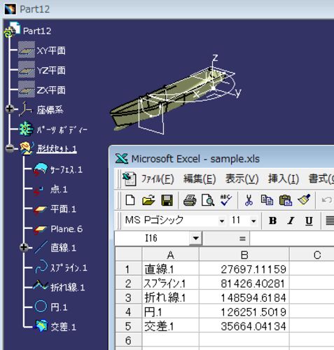 こちらの続きです。 形状セット内の線の長さを表示する - C#ATIA 前回の結果を「Excelのシートに出力したい」と言うことなので コードを変更しました。 'vba GetCurvesLength_ToExcel Sub CATMain() '選択 Dim Msg$: Msg = "形状セットを選択して下さい" Dim SelItem As…